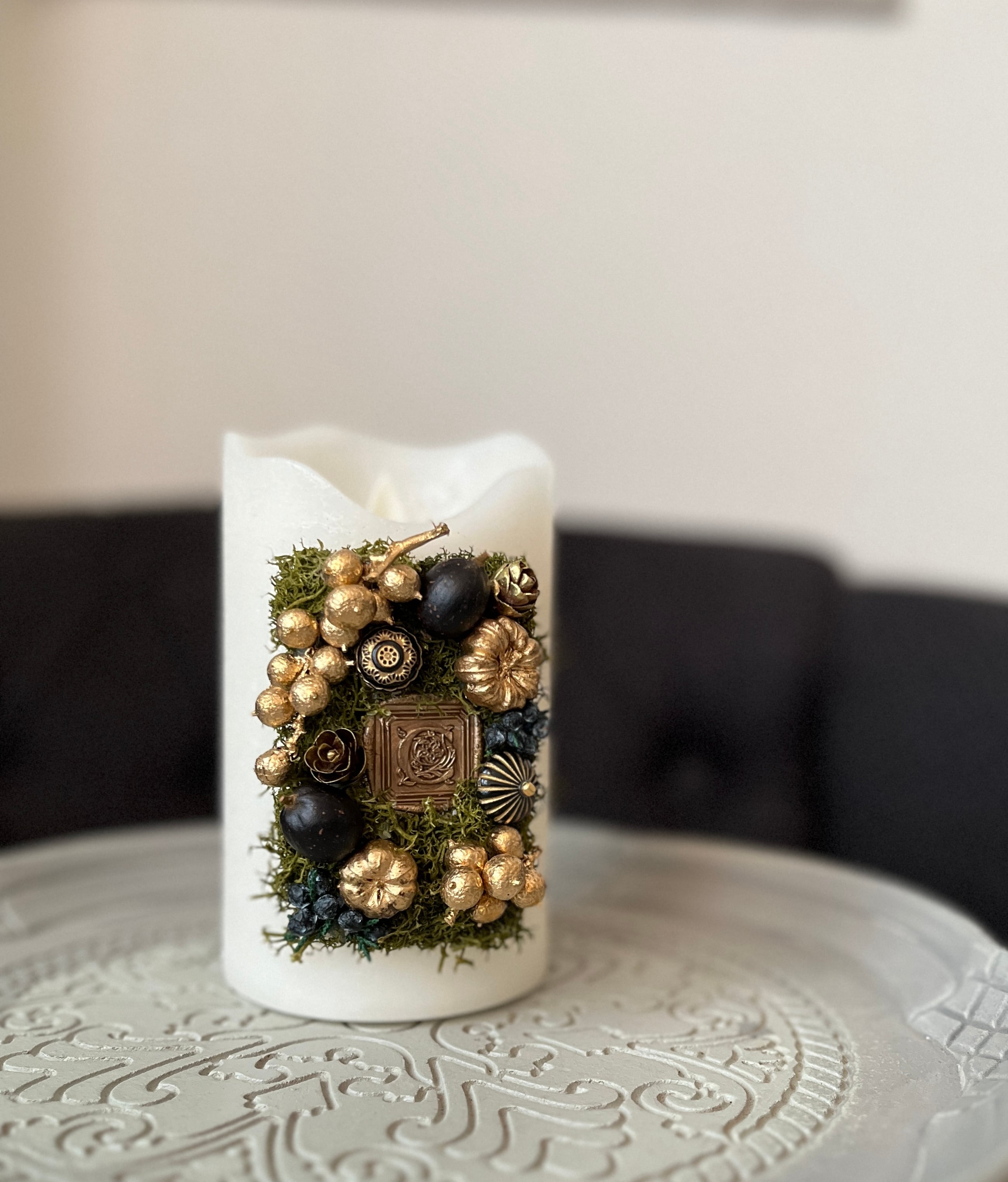 ホワイトのキャンドルにスクエア上にモスを敷き詰め、ゴールドやブラック系の実物でデコレーション。
