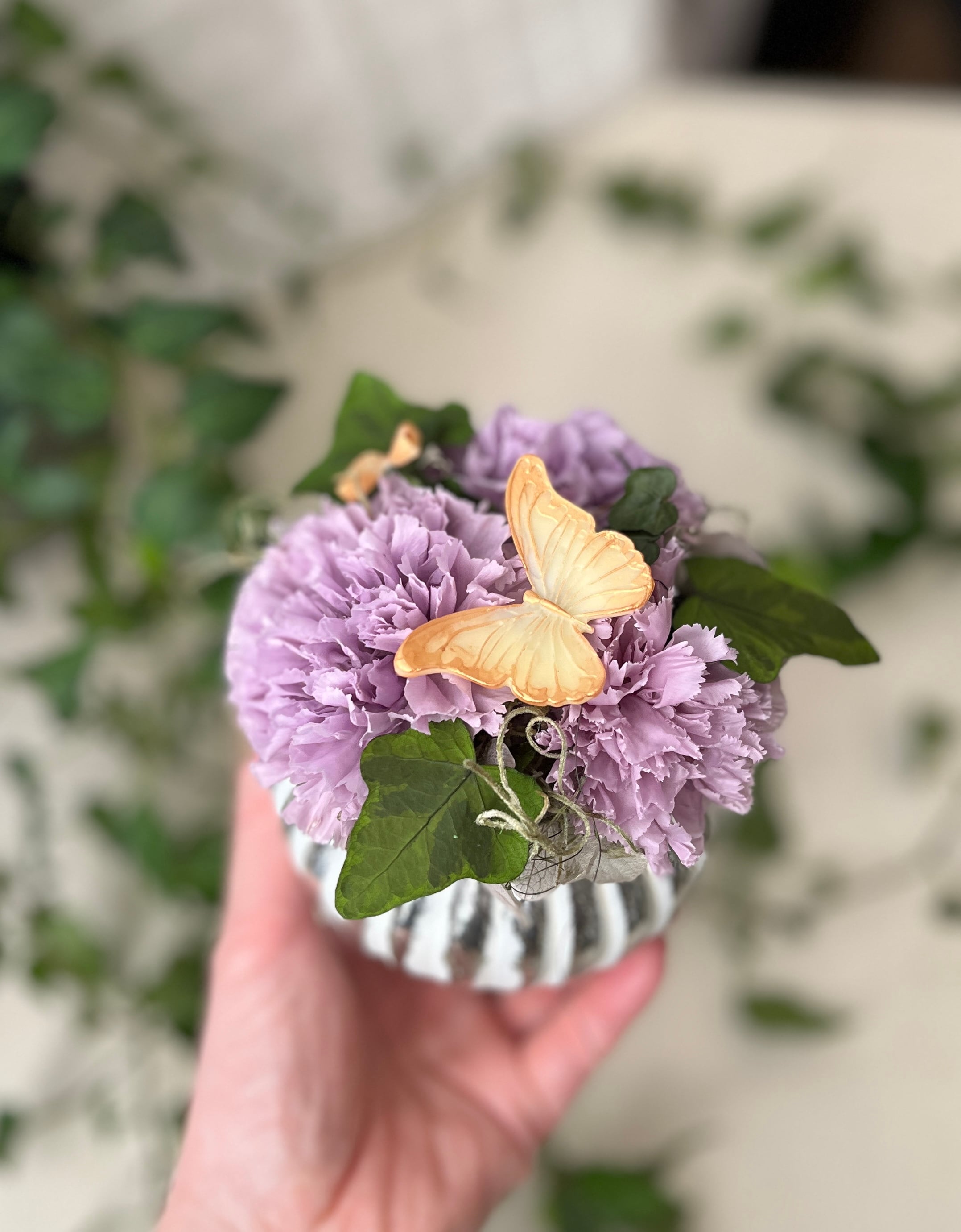 カーネーションの周りをひらりと舞うように添えた、ハンドメイドの大小の蝶々パーツがポイントです。
