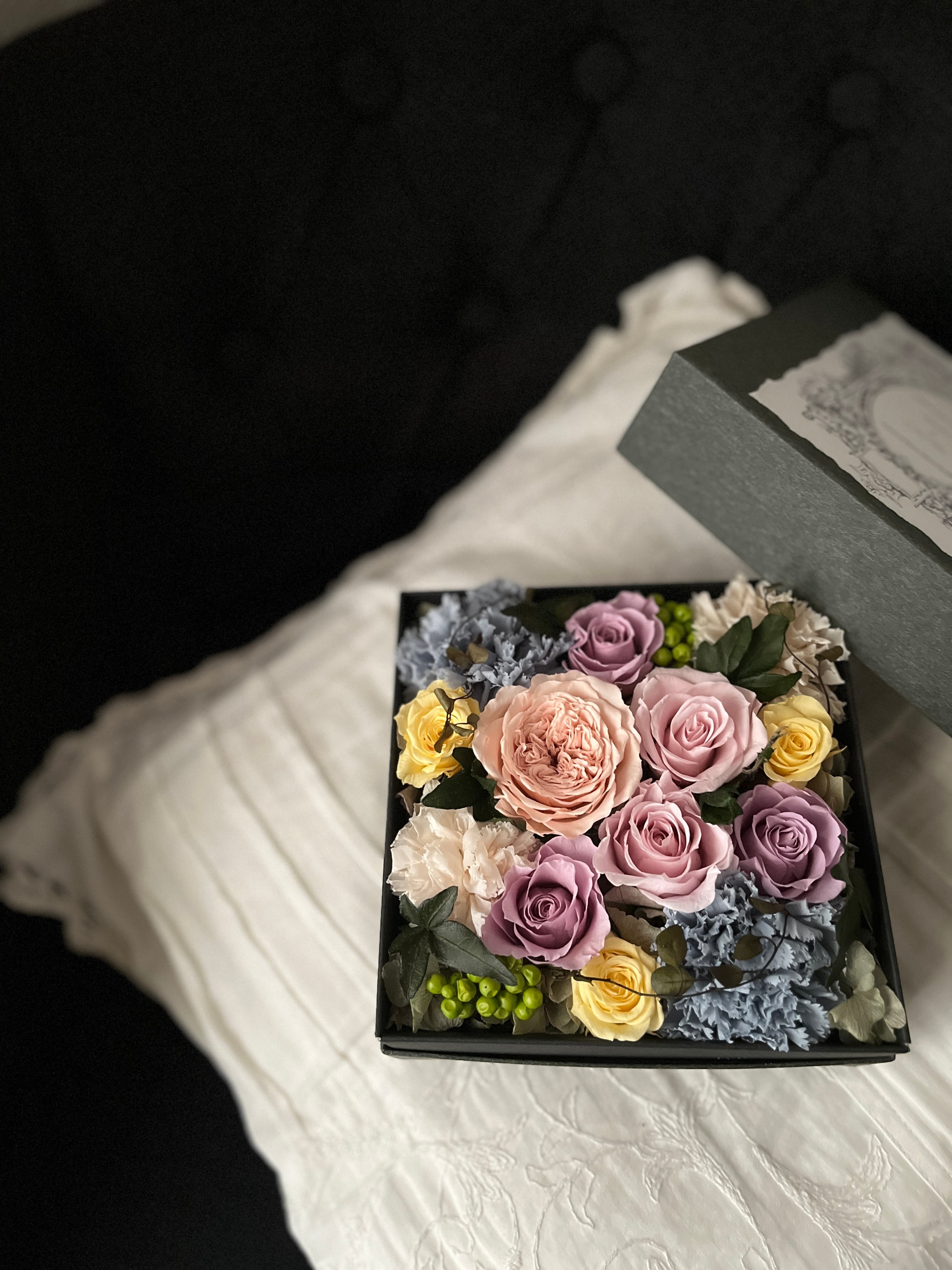 墨黒のスクエアボックスに砂糖菓子カラーのお花を詰めました。