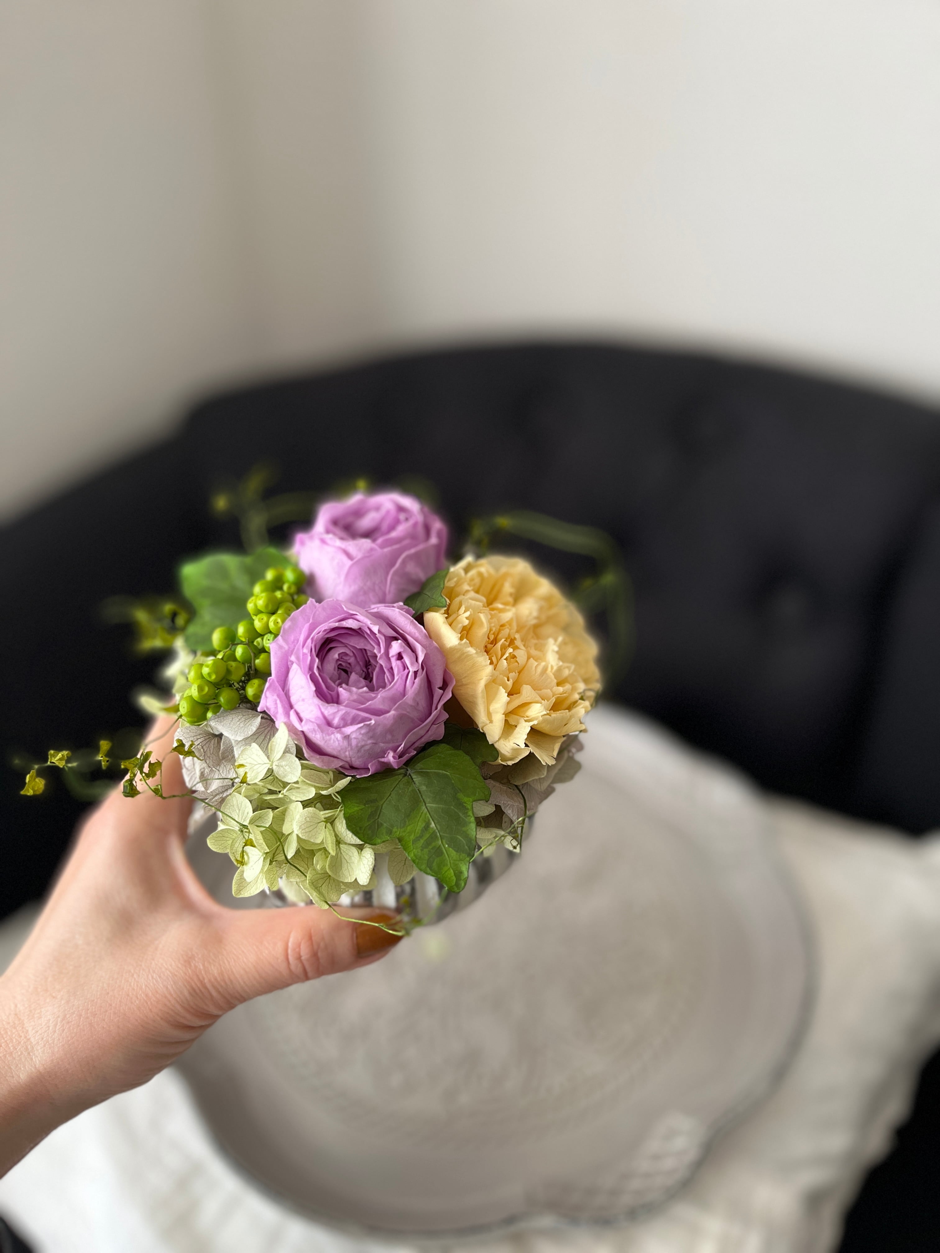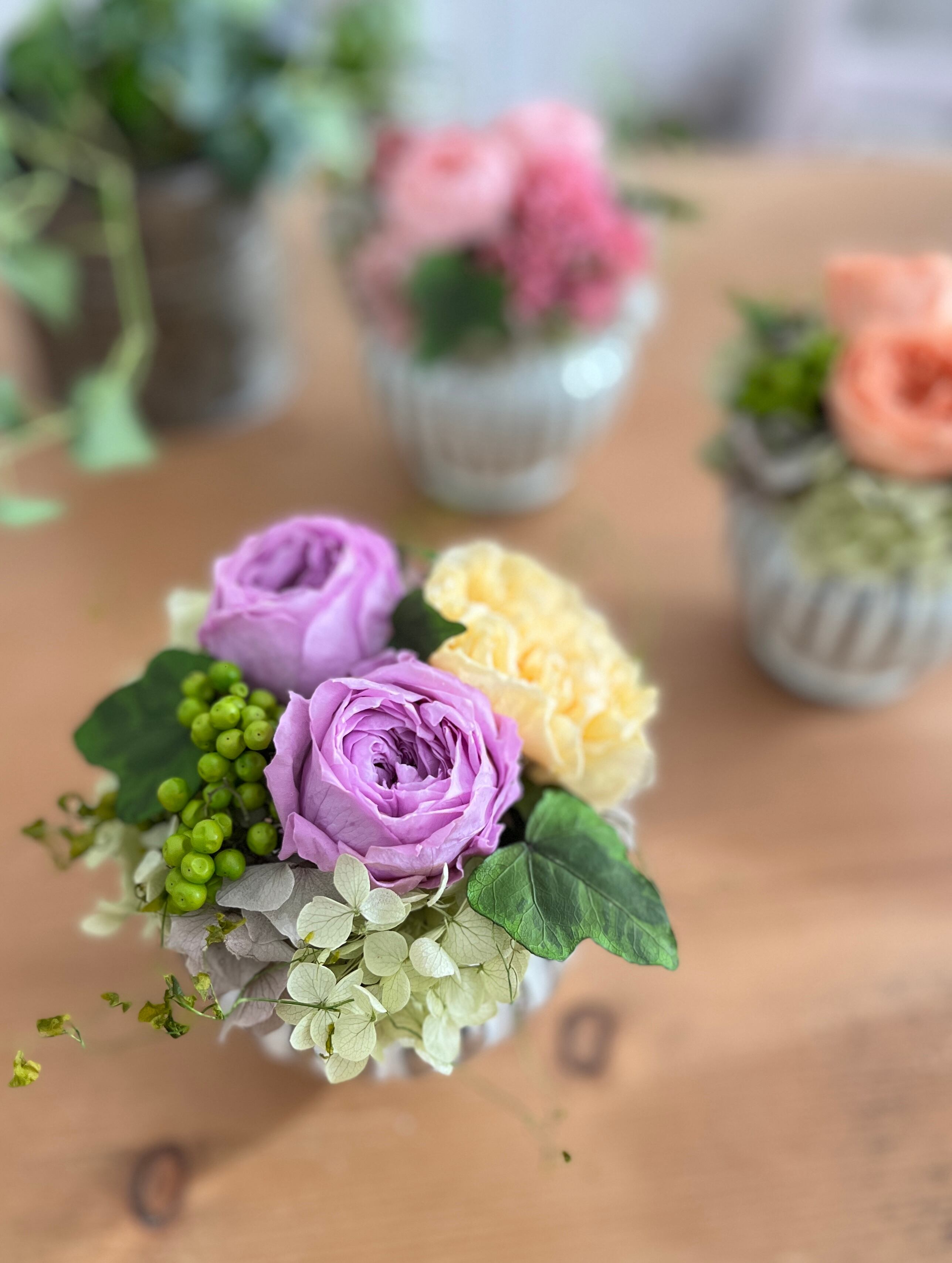 ナチュラルでフレッシュな生花のみずみずしさそのままに、いつまでも枯れないアレンジ。