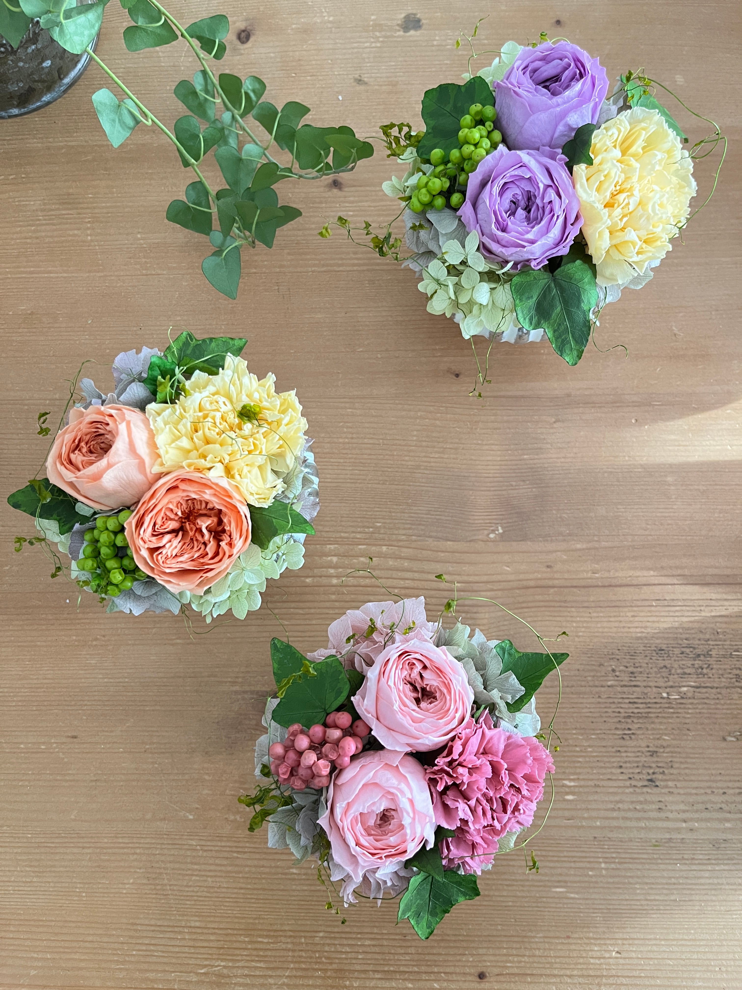 花材:オールドローズ、カーネーション、アジサイ、ペッパーベリー、グリーン(全てプリザーブド)